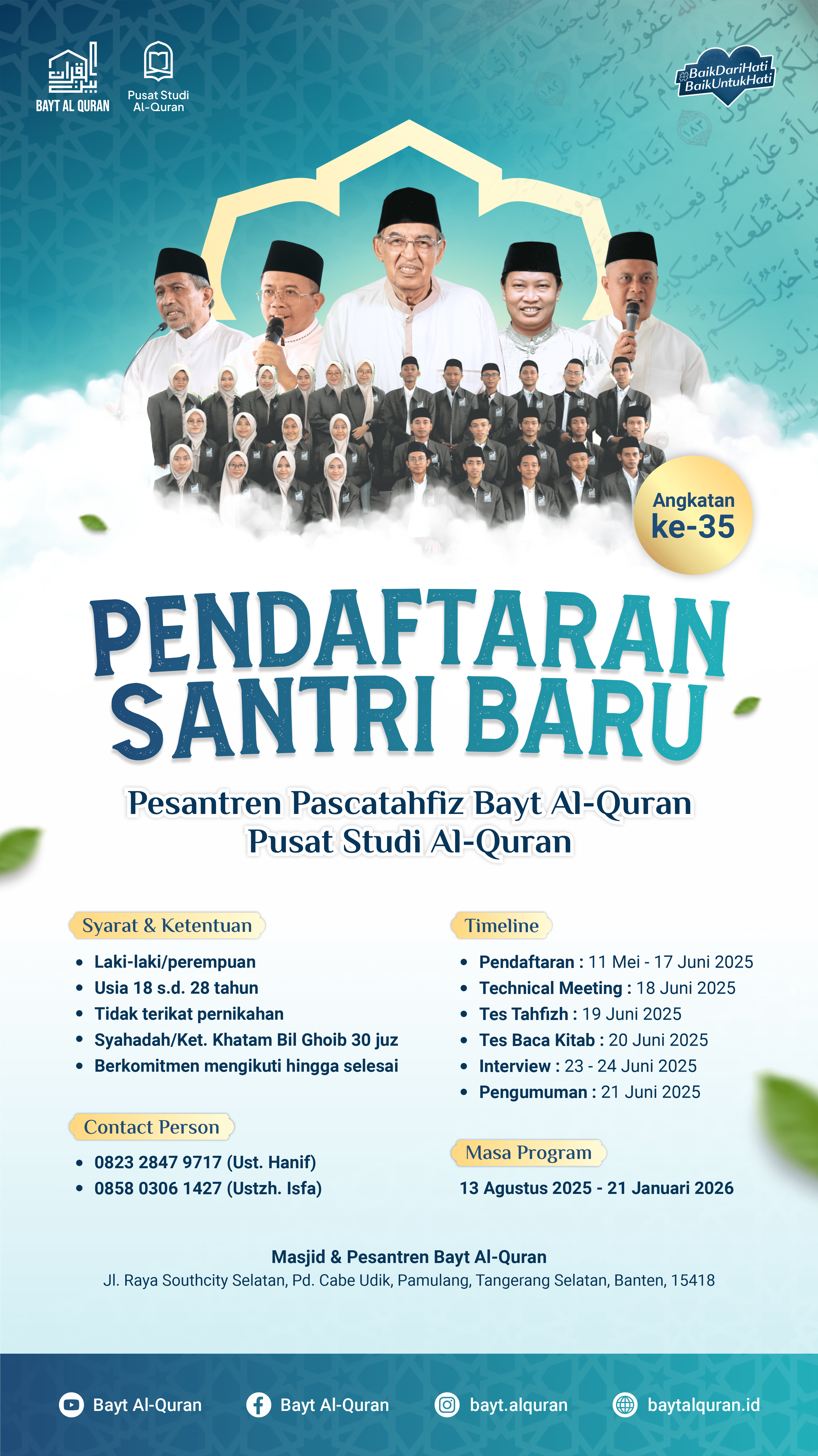 Pesantren Pascatahfiz Bayt al-Quran merupakan salah satu program unggulan dari Pusat Studi al-Quran yang didirikan oleh Prof. Dr. M. Quraish Shihab, MA. Program ini berbentuk pendidikan intensif pendalaman ilmu al-Qur’an selama enam (6) bulan untuk setiap angkatannya. Keunikan Pesantren Bayt al-Quran terletak pada pada persyaratan utamanya, yaitu peserta harus telah menyelesaikan hafalan 30 juz al-Qur’an. Setiap angkatan dibatasi hanya untuk 30 peserta, baik putra maupun putri, yang telah lolos seleksi kemampuan hafalan serta dasar bahasa Arab. Para peserta berasal dari berbagai pesantren dan lembaga tahfiz di seluruh Indonesia. Padahal, para hafiz al-Qur’an adalah potensi besar yang perlu difasilitasi dengan program khusus untuk meningkatkan wawasan keilmuan dan kapasitas hafalannya. Program Pascatahfiz Bayt al-Quran hadir untuk membekali para peserta dengan dasar-dasar keilmuan al-Qur’an, peningkatan kualitas hafalan, serta wawasan keislaman dan kebangsaan. Penanaman nilai wasathiyyatul Islam (Islam moderat) menjadi prinsip utama dalam seluruh kegiatan pembelajaran. Program ini bersifat beasiswa, yang berarti seluruh kebutuhan pokok peserta ditanggung sepenuhnya, mulai dari pembelajaran, konsumsi, hingga kebutuhan harian lainnya. Sejak berdiri pada 18 Agustus 2009, program ini telah menghasilkan 1.074 alumni. Para alumni diharapkan kembali ke daerah asal untuk menyebarkan ilmu, khususnya nilai-nilai moderat yang diajarkan oleh Pusat Studi al-Quran. Banyak di antaranya yang telah berkiprah sebagai akademisi, wirausaha, pengelola pesantren, atau melanjutkan studi baik di dalam maupun luar negeri. Alumni Bayt al-Quran menjadi bagian dari keluarga besar Pusat Studi al-Quran, yang terhubung melalui jaringan IKA-BQ (Ikatan Alumni Bayt al-Quran). Jejaring ini berperan dalam menjaga komunikasi, memberikan kontribusi, serta menyumbangkan masukan guna penyempurnaan program di masa mendatang. Saat ini, Pesantren Pascatahfiz Bayt al-Qur’an membuka rekrutmen santri baru untuk angkatan ke-35, dengan masa program 13 Agustus 2025 hingga 21 Januari 2026. Mari daftarkan diri Anda atau orang terdekat Anda untuk mengikuti Program Bayt al-Qur’an. Informasi lengkap mengenai persyaratan dan proses pendaftaran dengan rincian sebagai berikut: KRITERIA PESERTA PASCATAHFIZH REGULER Peserta Program Pesantren Pascatahfizh Bayt Al-Quran ini berjumlah 30 dengan kriteria sebagai berikut: WAKTU PELAKSANAAN Pendaftaran Technical Meeting Test dan Seleksi: Materi al-Qur’an dan Hafalan 19 Juni 2025 Baca Kitab Berbahasa Arab 20 Juni 2025 Interview 23 -24 Juni 2025 Pengumuman Kelulusan 21Juni 2025 Pelaksanaan Program 13 Agustus 2025 – 21 Januari 2026 MATERI YANG DISAJIKAN Materi Utama: Ulumul Qur’an, Qawa’id Tafsir, Qira’at, dan Manahij Mufassirin Materi Penunjang: Tafsir Maudhu’i, Tafsir Ayat Ahkam, Ilmu Hadits, Sirah Nabawiyah, Balaghah al-Qur’an, Moderasi Beragama, Pendekatan Semantik dalam Studi al-Qur’an, Pendekatan Sufistik dalam Tafsir al-Qur’an, Psikologi Pengembangan Diri, Wawasan Kebangsaan. Materi Kepesantrenan: Muraja’ah Hafalan al-Qur’an, Khatmul Qur’an setiap Jumat, Kultum, Diskusi Literatur Tafsir, Mengaji Sorogan (Kitab Ulumul Qur’an), dan Bincang Pemikiran Kontemporer. Kewirausahaan: koperasi atau jenis usaha dalam lingkungan BQ-PSQ. NARASUMBER Prof. Dr. M. Quraish Shihab, MA. Prof. Dr. Nasaruddin Umar, MA, Dr. Ahsin Sakho, Muhammad, MA, Dr. Muchlis M Hanafi, MA, Dr. M. Ali Nurdin, MA, Dr. A. Husnul Hakim, MA, Dr. Sahabuddin, MA, Prof. Dr. Asep Usman Ismail, MA, Laksda (Purn) Husein Ibrahim Assegaf, MBA. Najelaa Shihab, M.Psi., Muhammad Arifin, MA, Faried F. Saenong, Ph.D, Romli Syarqowi, MA. Dr. Syahrullah Iskandar, MA, Dr. Ulinnuha Husnan, MA, Dr. Moch. Syarif Hidayatullah, Lc., M.Hum., Dr. Andi Rahman, MA, Dr. Zainal Arifin Madzkur, MA, Dr. Fakhrurrozi, MA, Dr. Nur Rofi’ah, Bil.Uzm., Masrur Ikhwan, MA, Wafa al-Fadli, S.Ag., Nashrullah, Lc. PENDAMPING Pengurus Pesantren Pascatahfizh Bayt al-Quran-PSQ SARANA PEMBELAJARAN Pembelajaran dilakukan secara offline atau tatap muka di kelas dan/atau di Masjid Bayt al-Quran METODE PEMBELAJARAN Metode pembelajaran pada Program Pesantren Pascatahfizh Bayt Al-Quran ini meliputi: Metode Ceramah da Tanya-Jawab, yaitu narasumber menyampaikan materi sesuai topik dan durasi waktu yang telah ditentukan. Di akhir disediakan waktu untuk peserta bertanya atau menanggapi materi yang disajikan narasumber. Metode ini akan lebih dominan digunakan dalam pelaksanaan program ini. Metode Diskusi, yaitu narasumber/fasilitator telah menetapkan sejumlah topik dan membagi kelas ke dalam beberapa kelompok. Setiap kelompok secara bergiliran setiap pertemuan menjadi presentator sesuai topik yang telah ditentukan. Setelah presentasi, ada alokasi waktu untuk dialog interaktif bagi santri lainnya. Metode Resitasi, yaitu narasumber/fasilitator mengarahkan peserta untuk menyusun sebuah resume terkait materi yang sudah disampaikan oleh narasumber/presentator. Metode Training, yaitu melatih keterampilan (soft skill) peserta dengan cara menyusun artikel/makalah ataupun review buku dan semisalnya terkait materi yang disajikan. PEMBIAYAAN Pelaksanaan Program Pesantren Pascatahfizh Bayt Al-Quran ini tidak dipungut biaya dari peserta. Pembiayaan sepenuhnya dari pelaksana program, yaitu Pusat Studi al-Quran.